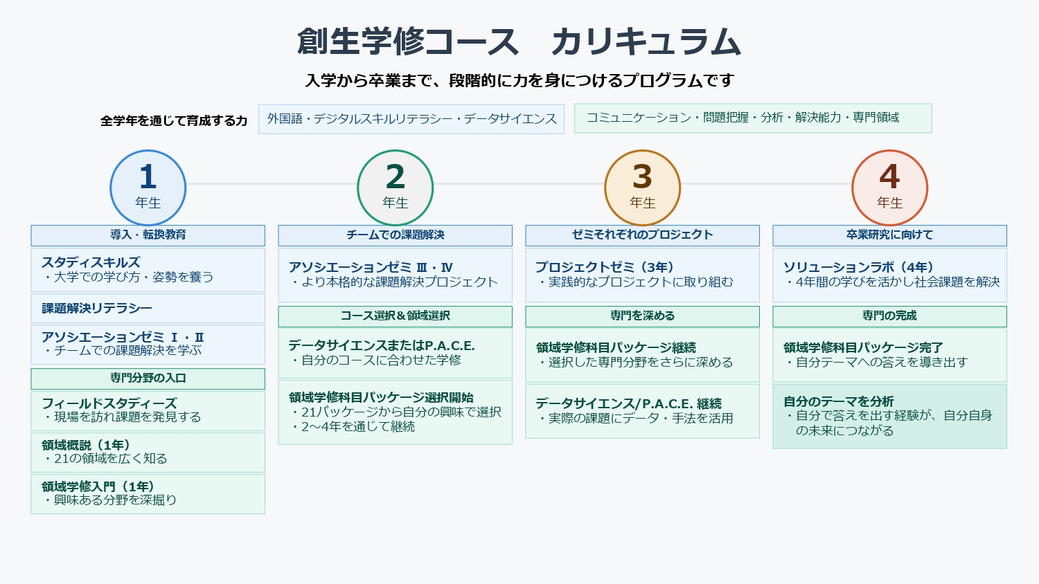 創生学修コースでの学修は、1年次に導入・転換教育と専門分野の入口、2年次にチームでの課題解決、コース選択&領域選択、3年次にゼミそれぞれのプロジェクト、専門を深める、4年次に卒業研究に向けて・専門の完成という構成により、学年ごとの学修を通じて、専門性と実践力を兼ね備えた創造的な人材の育成を目指しています。